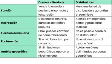 Comercializadora: El usuario puede contactar a la comercializadora para contratar o cambiar de tarifa, para aclarar dudas sobre la factura o hacer una reclamación por cobros o datos incorrectos en su factura