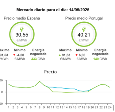 Como observamos en dicho gráfico, para el día 14/05/2025, tenemos un precio mínimo de la energía de -4€ y un precio máximo de 91,53€. Con esto podemos ver perfectamente, la fluctuación del precio de la electricidad en un intervalo de 24h.