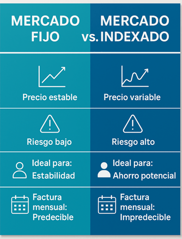 Dos de las opciones más comunes son el mercado indexado y el mercado fijo. Aunque ambos son modelos que nos permiten acceder a la electricidad, su funcionamiento y precios pueden variar considerablemente, y puede marcar la diferencia en nuestro gasto mensual.
