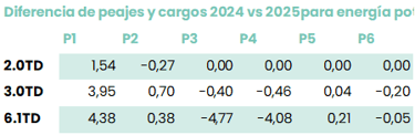 Primero de todo en la siguiente tabla encontrarás el diferencial de los antiguos costes con los nuevos costes de 2025 para la parte de consumo energético: