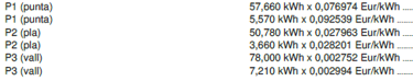 Como se puede observar, se tienen diferentes cargos a diferentes precios por cada periodo de consumo: punta, llano y valle. Esto es porque la comercializadora ha facturado los días de diciembre a los costes de 2024 y los días de enero a los nuevos costes regulados. Como se observa en la imagen, algunos suben bastante y otros bajan un poco.